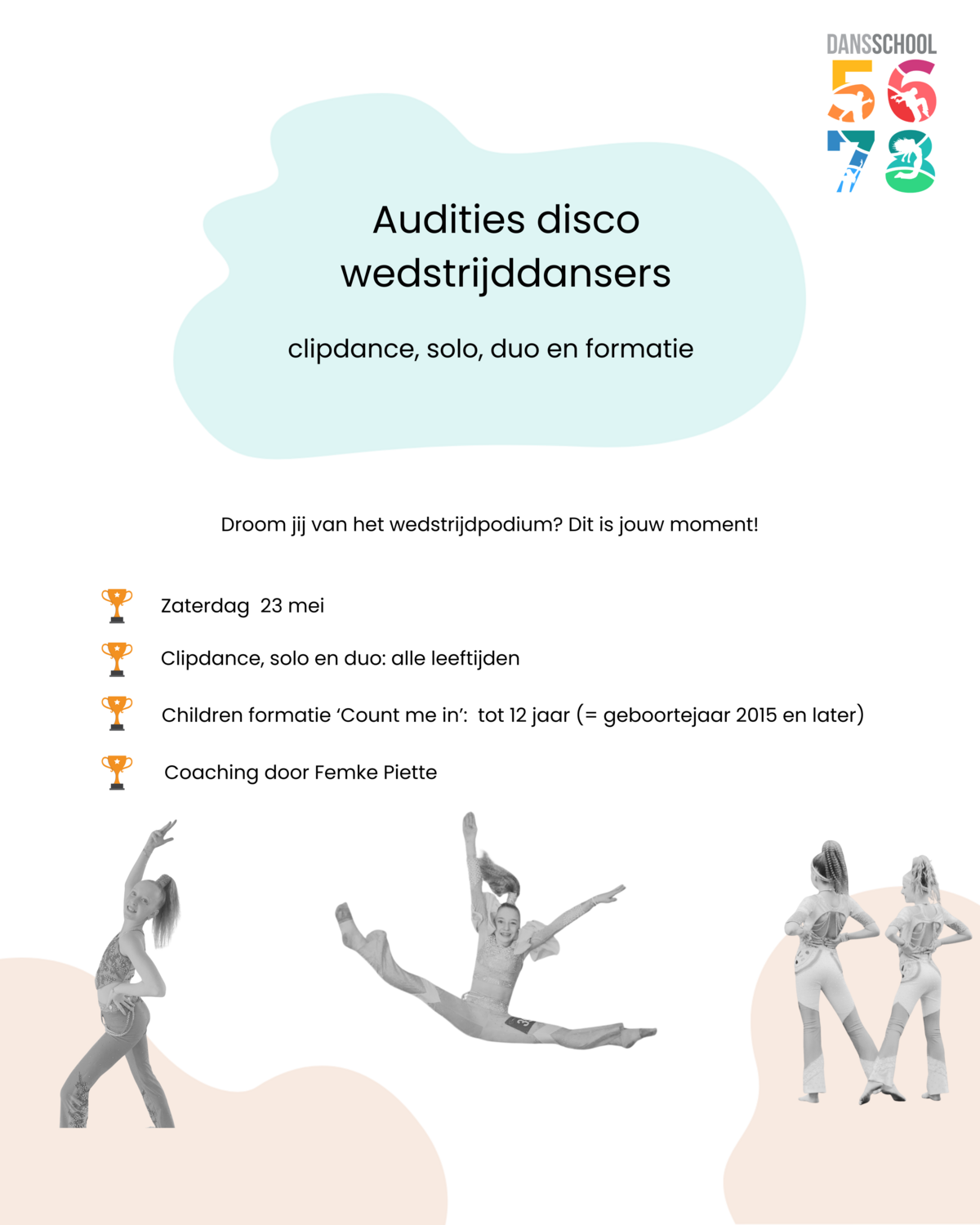 Voor deze nieuwe groep zijn we op zoek naar dansers van 11 jaar (geboortejaar 2015) of jonger. Voor deze auditie hoef je niets voor te bereiden. Coach Femke leert je een stuk choreografie aan.